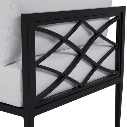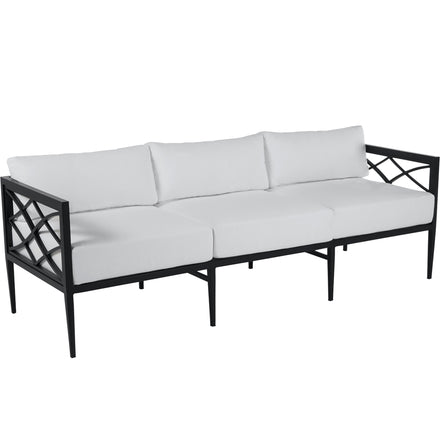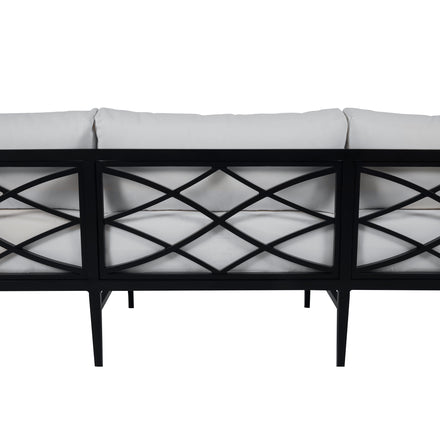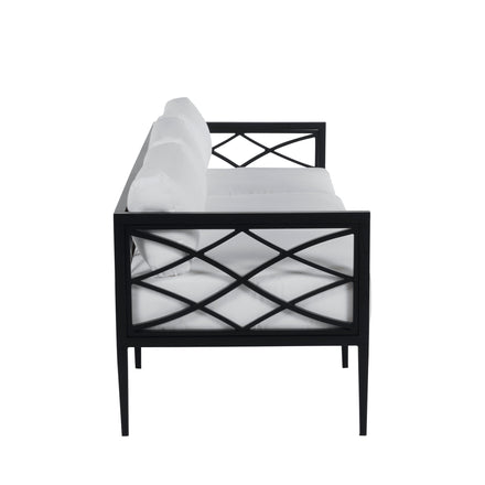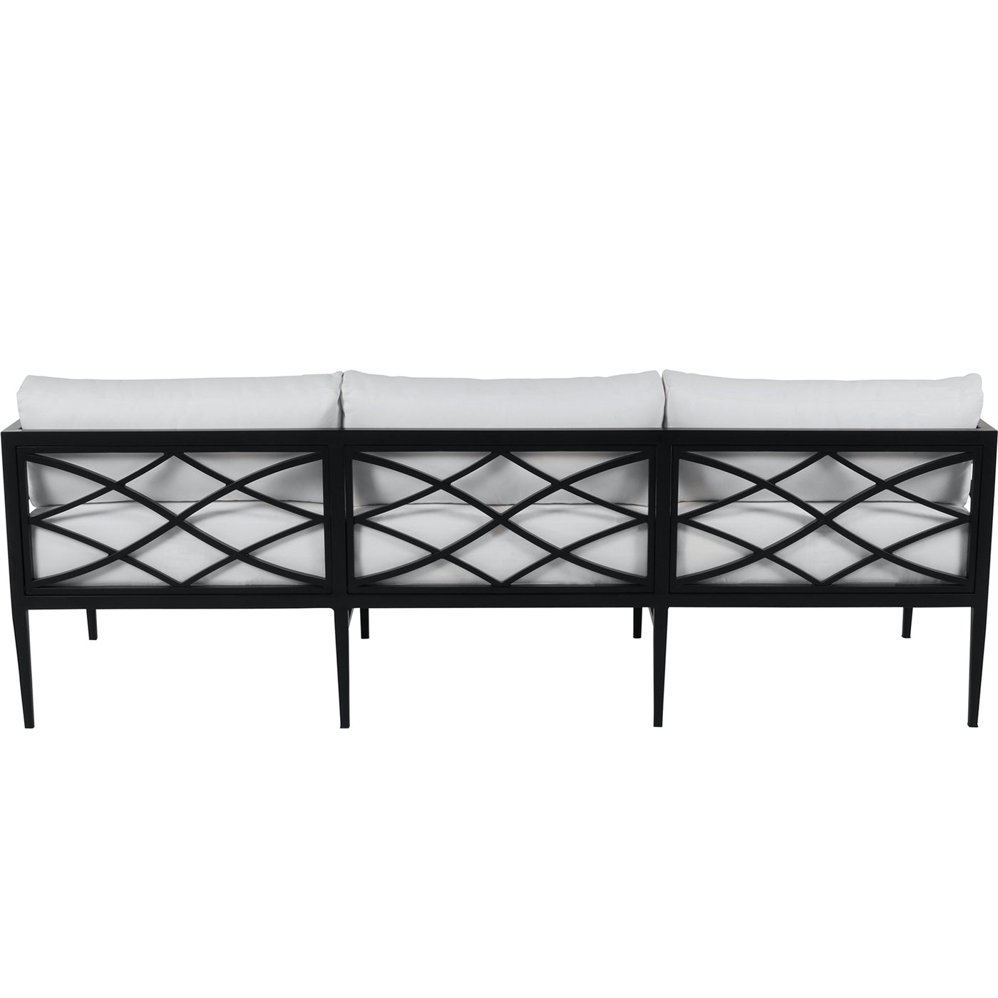 The Elegante Aluminum Sofa combines classic elegance with modern design. Its sleek white aluminum frame features a distinctive lattice pattern, adding an artistic touch to the clean lines and minimalist aesthetic. The crisp geometric shapes create a sophisticated look suitable for various outdoor settings, from urban balconies to garden patios. Crafted from premium wrought aluminum, this table boasts a triple-layer coating—powder, dry, and polyurethane clear coats—providing ultimate weather resistance and preventing corrosion, fading, and wear. Its thick walls and internal supports offer unparalleled strength and stability, ensuring long-lasting durability even under heavy use.