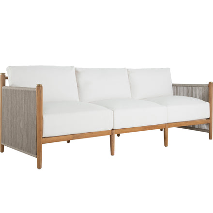 The Pacifica Sofa marries modernity and natural beauty, featuring a teak frame with vertical olefin rope, known for its durability and weather-resistance, and brass toppers destined to patina beautifully. Plush cushions enhance comfort, while the unique rope back offers support and style. This collection, designed for durability promises longevity, weather resistance, and minimal maintenance. Please note, that due to its high-quality center cut, and natural oils, teak will age gracefully without the help of cleaners and protectors.