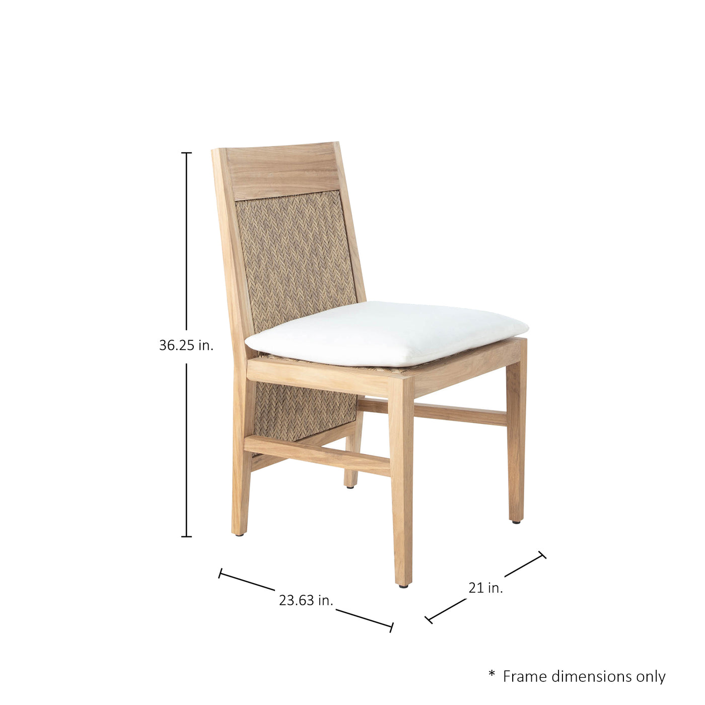 Our Savannah Teak Collection is where the warmth of natural teak meets the resilience of N-Duraâ„¢ resin wicker. This Savannah Teak Side Chair is sculpted for those who appreciate the timeless beauty of teak, enhanced with UV-resistant wicker for enduring allure. Each handcrafted piece adds a layer of unparalleled quality. Perfect for outdoor sanctuaries, it combines the organic charm of wood with modern durability, offering a sanctuary of style and tranquility that stands the test of time. Please note, that due to its high-quality center cut, and natural oils, teak will age gracefully without the help of cleaners and protectors. Our exclusive N-Duraâ„¢ Ultra Resin Wicker sets our outdoor furniture apart with unmatched durability and UV protection in the industry. This item is designed to be enjoyed either with or without a cushion. Please designate your choice in the below "Select a Cushion" dropdown.