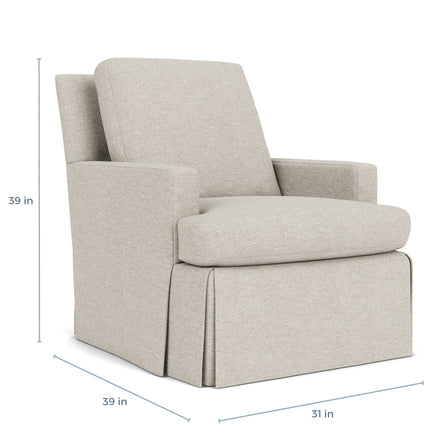 The Avondale Falls Swivel Chair, handcrafted in North Carolina, combines traditional craftsmanship with comfort-focused design with the added functionality of swivel movement. Featuring square armrests and a plush back cushion, its fully skirted base adds a touch of elegance. The back's slight outward angle ensures maximum comfort, making it a refined choice for any living space.