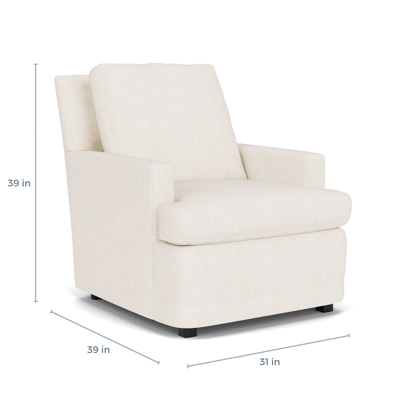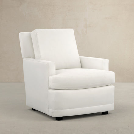 The Avondale Park Chair, handcrafted in North Carolina, combines traditional craftsmanship with comfort-focused design. Featuring square armrests and a plush back cushion, its fully tailored base adds a touch of elegance. The back's slight outward angle ensures maximum comfort, making it a refined choice for any living space.