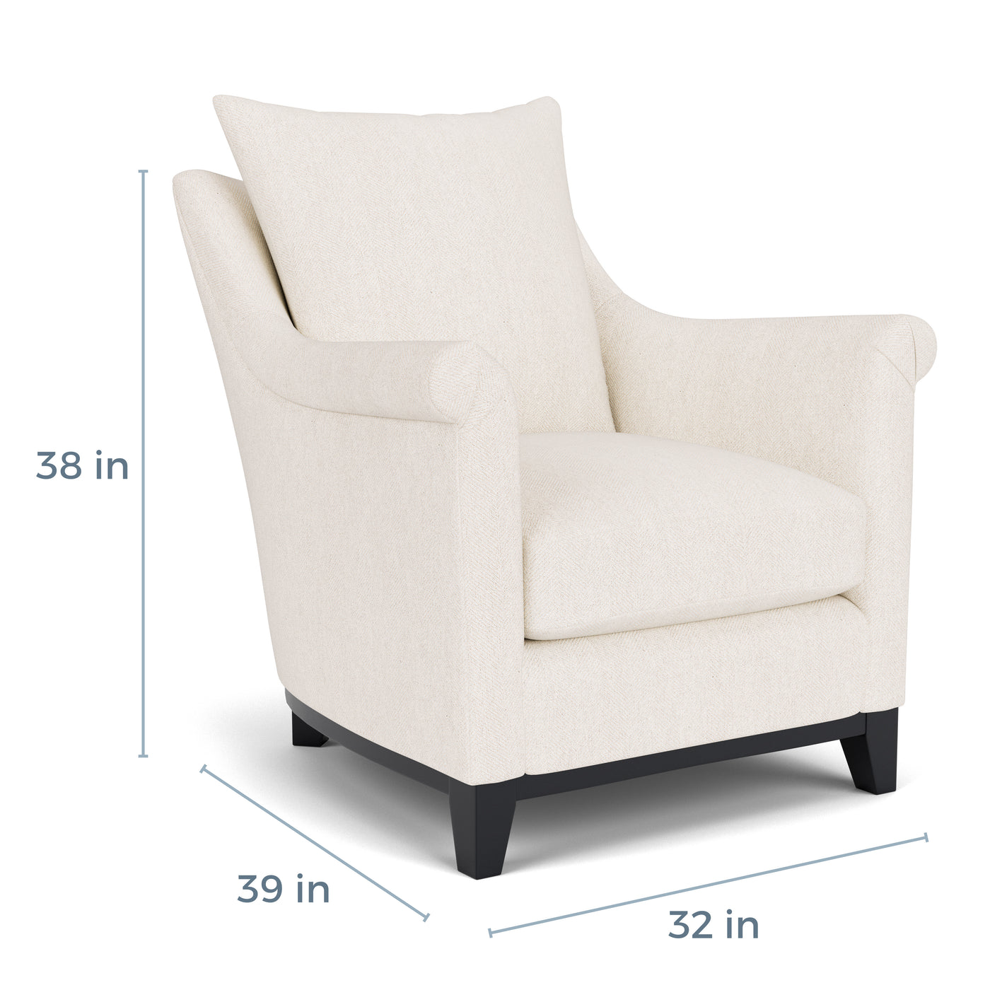 The Devin Chair mirrors the timeless and traditional silhouette of the Devin Falls Sofa, featuring a high back and elevated arms for both style and comfort. With its English rolled arms, delicate pleating, and elegant piping, this chair combines classic design elements with a minimalist sensibility. The bottom of the chair exposes the sturdy wood frame, enhancing its sophisticated appearance. Handcrafted in North Carolina, each chair is a unique addition to any space, maintaining the custom-made quality that defines the collection.