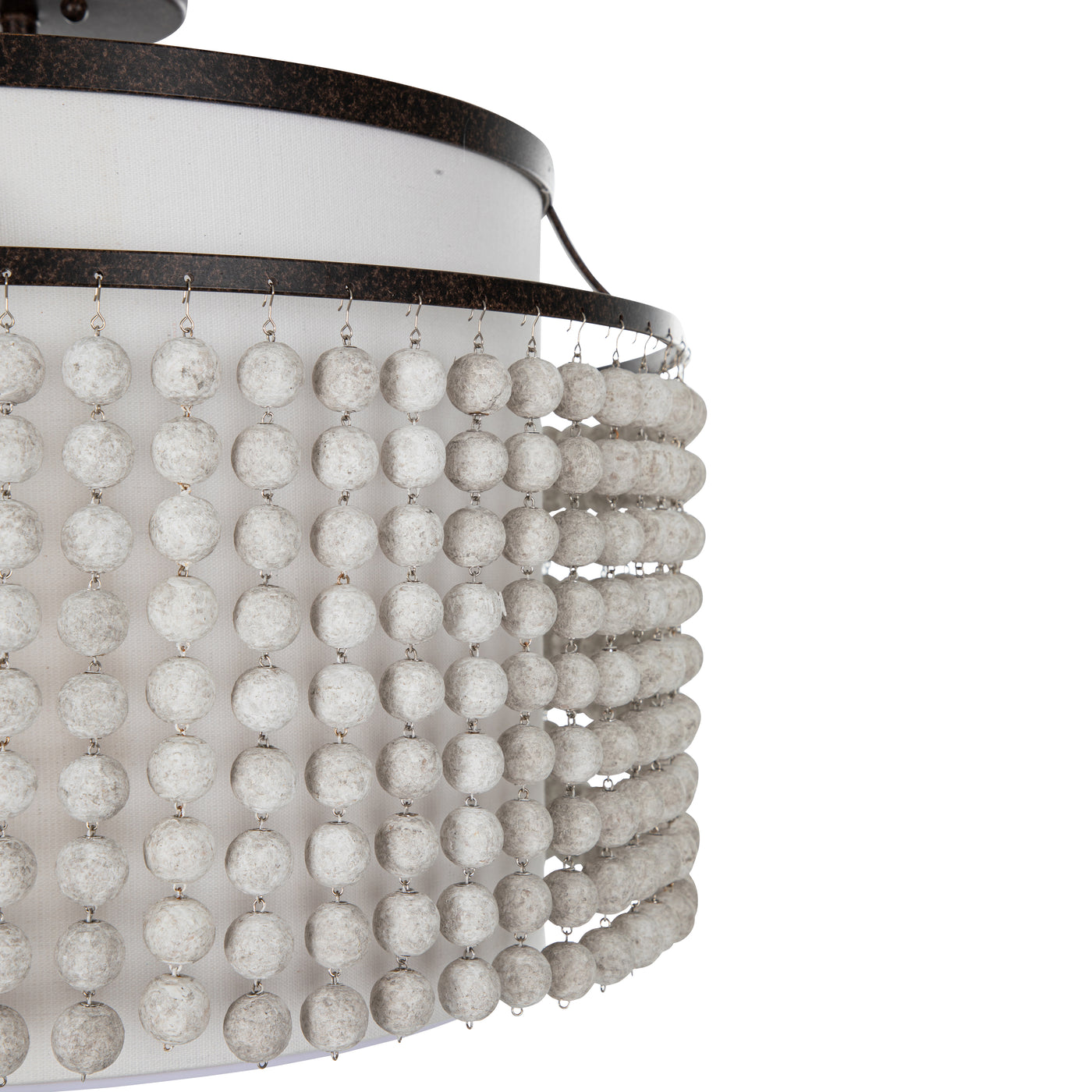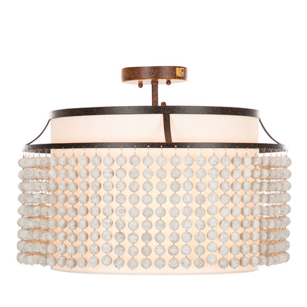 The Joanna Semi-Flush Mount combines rustic charm with elegant details, creating a distinctive statement for your ceiling. Finished in Venetian rust, the fixture features cascading distressed ivory wooden beads that add texture and warmth. A feather white linen accent and white acrylic diffuser ensure a soft, ambient glow, making it perfect for dining rooms, entryways, or bedrooms. Blending timeless materials with a refined design, the Joanna Semi-Flush Mount enhances any space with its unique character and inviting light.