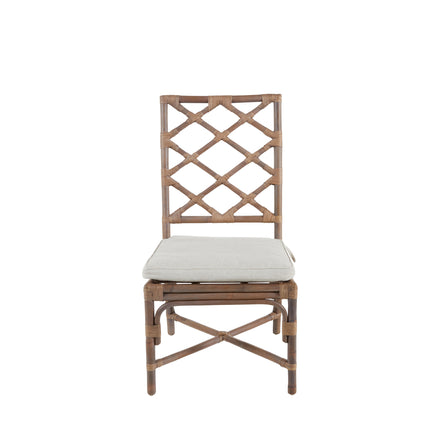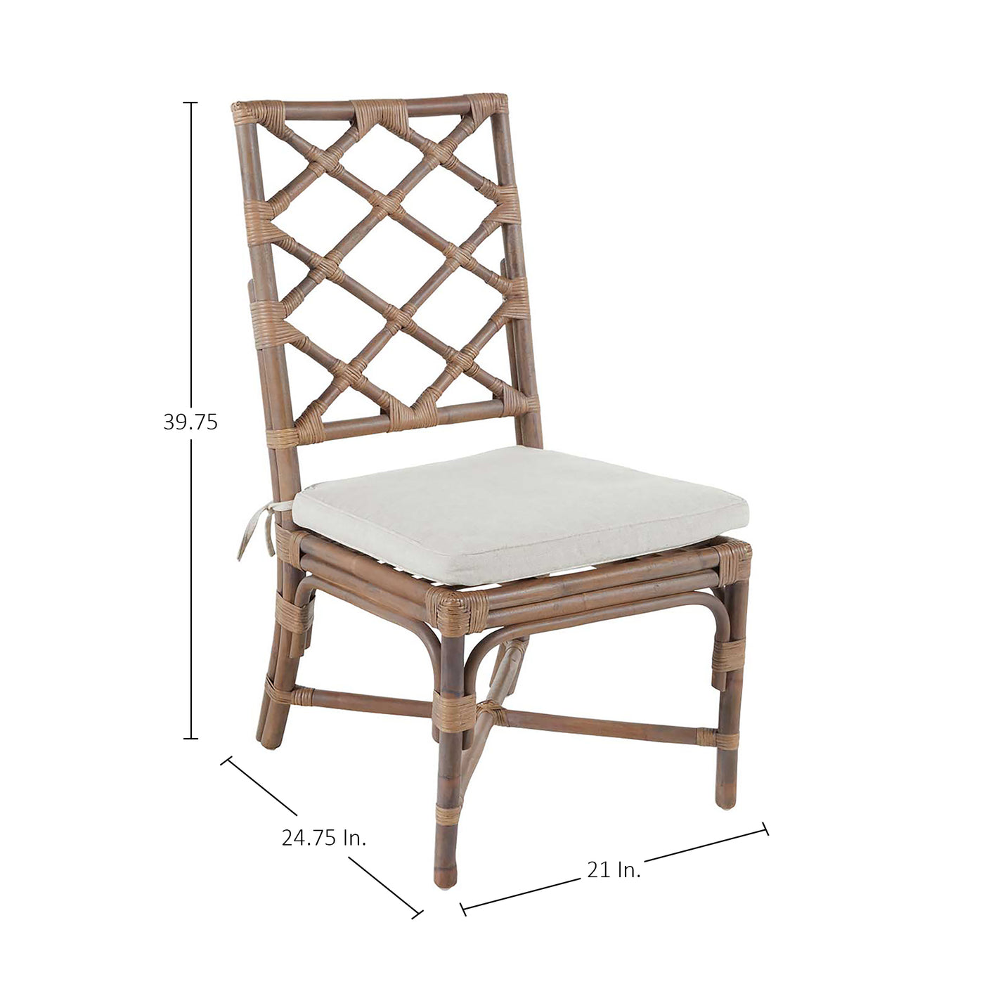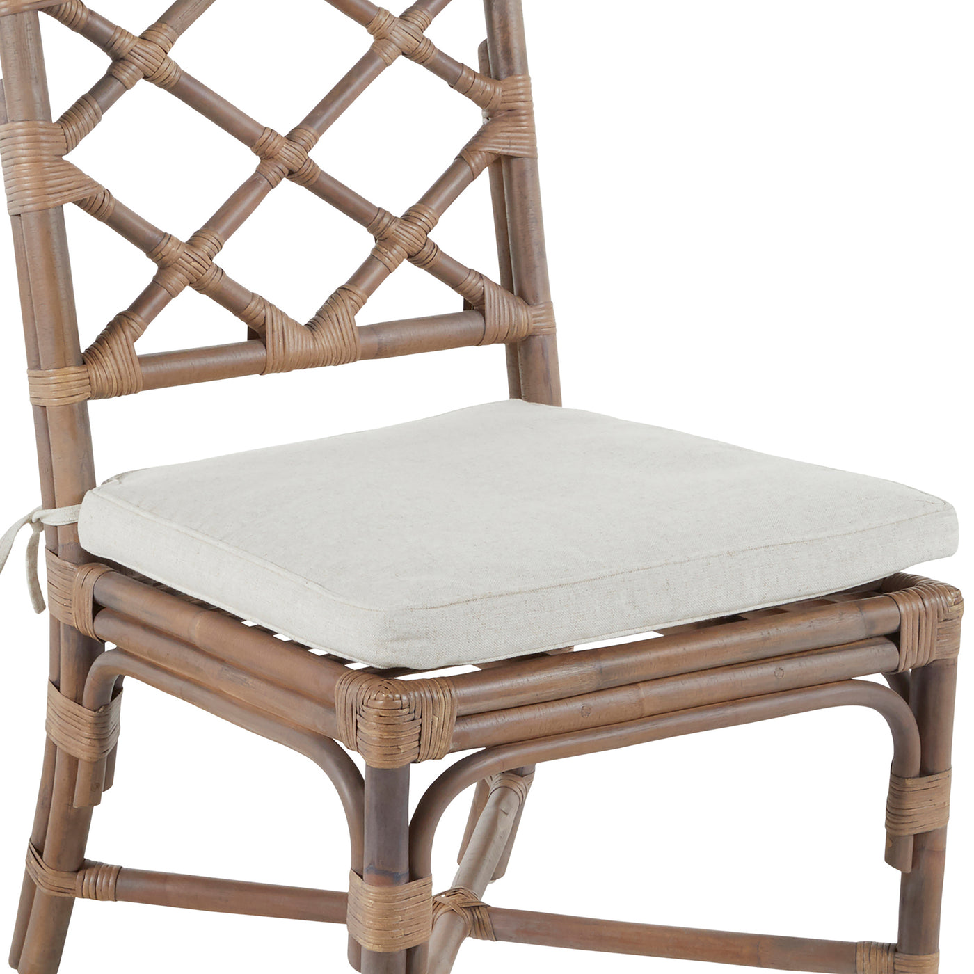 The Kennedy Dining Chair combines transitional styling with the natural beauty of rattan, featuring a lattice back with crisscrossed rattan rods creating a diamond-shaped pattern. Made from washed rattan, this chair adds casual sophistication to any dining space with the rattan bindings adding both strength and a decorative element. The cream linen seat cushion provides a soft and inviting place to sit, while the natural variations in the rattan ensure each chair is unique. Ideal for dining rooms, breakfast nooks, or covered outdoor spaces, the Kennedy Dining Chair enhances your home with its blend of comfort and style.