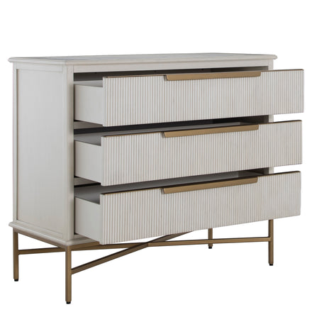 The Riggs Chest in Distressed Antique White brings fresh brightness and refined texture to your space. Featuring a soft tonal finish over its ribbed drawer fronts, this chest effortlessly balances relaxed charm with clean, architectural lines. Elevated on a warm satin brass base with matching sculptural hardware, it includes three spacious soft-close drawers that glide quietly and smoothly-offering both elegance and everyday ease.